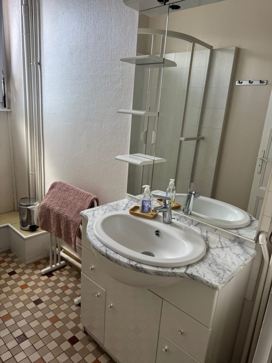 • Salle d’eau : douche 1/4 de cercle, meuble avec vasque et miroir, porte-serviette, sèche cheveux.