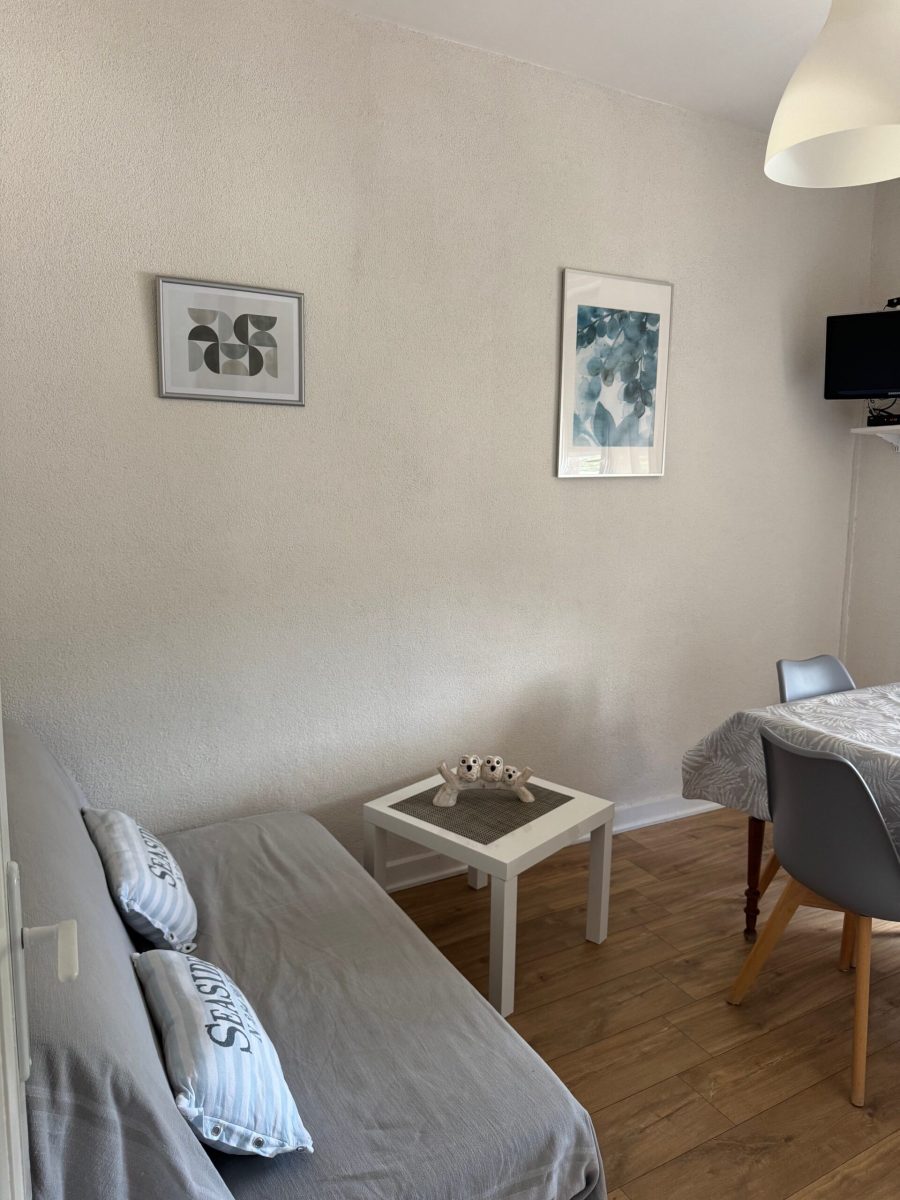 • Séjour : exposition sud, table rectangulaire, meuble bas (jeux et livres), canapé 3 places, TV satellite avec radio.